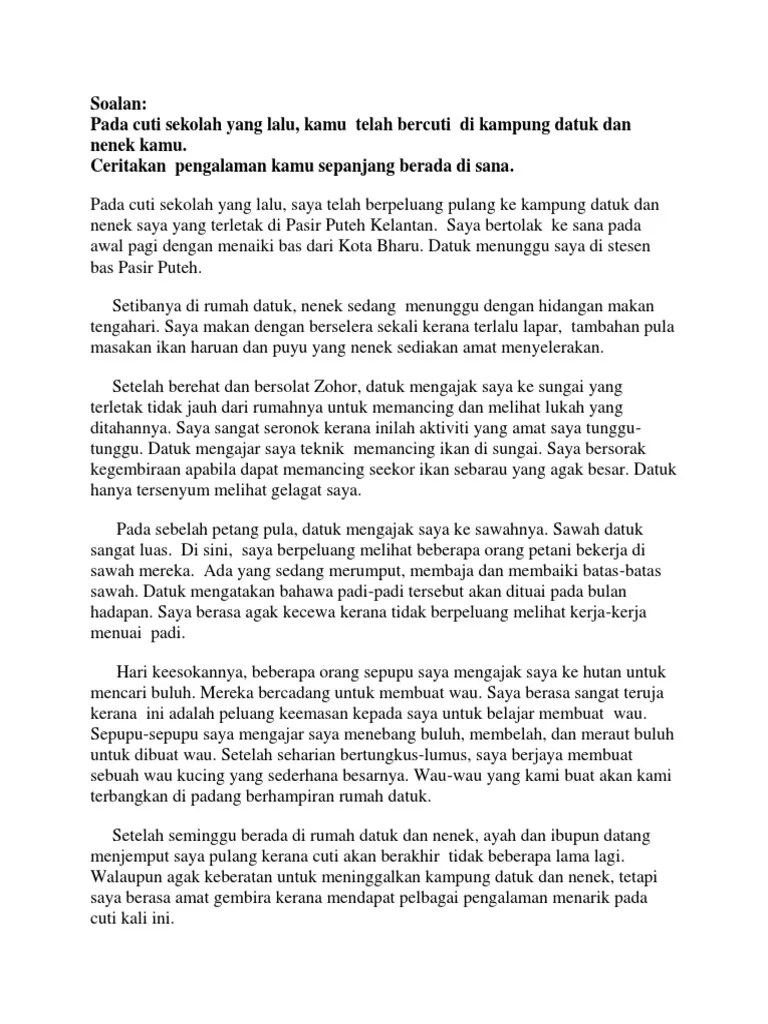 Tulis karangan tentang pengalaman percutian kamu itu. Karangan pengalaman bercuti di kampung tahun 5. Koleksi contoh karangan bahasa melayu bm upsr 5ujian pentaksiran. Pada cuti sekolah yang lalu kami sekeluarga berpeluang bercuti ke sebuah tempat peranginan iaitu pulau .